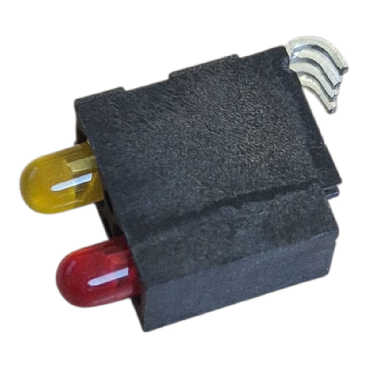 Componente eletrônico Mentor modelo 1801.1831. Possui dois LEDs de 3mm em um único encapsulamento, nas cores vermelho e amarelo, com corpo preto. Ideal para sinalização em placas eletrônicas e projetos diversos.